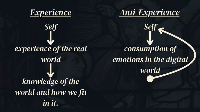 With the rise of the digital age, man seems to have made remarkable advancements. Connecting with others seems to be easier than ever before, information is more accessible, and it seems that one is able to be free of all their physical “limitations” in forming their personal identities. The rise of screens as a medium of experience has seemingly yielded these wonderful effects, but this new way of participating in “reality” actually vaguely represents real experience. Experience, is ultimately the engagement with what is outside of oneself. [1] The objects of experience that we encounter challenge and expand our understanding of the way things are. This new understanding directs us towards the world and enables us to act in meaningful ways. In the realm of anti-experience or that of digital consumption, however, the object of experience is no longer something in the external world, but it is one’s emotional responses.